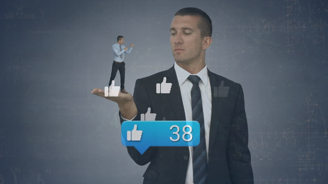 Caucasian businessman in suit holding a smaller version of himself, creatively illustrating the concept of self-influence or digital communication. The visual elements include social media 'likes' suggesting online popularity or networking impact. Useful for themes involving social media influence, business growth, digital strategy, or entrepreneurial success.