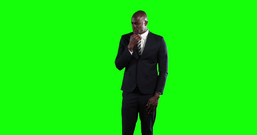An African American businessman in a suit is creating an impactful gesture with his outstretched hand as though he is holding an invisible object against a green screen. This visual can be effectively used in marketing materials, business presentations, or creative projects needing a transparent clear background to showcase concepts of innovation, decision-making, or imaginative thinking in the corporate world.