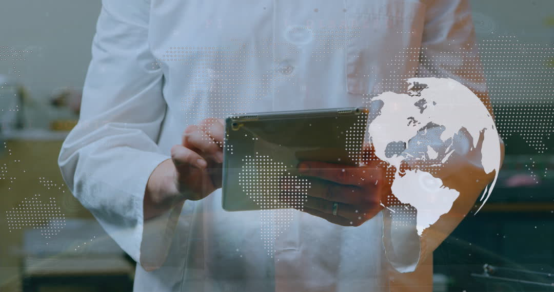 Businessman wearing a lab coat interacts with digital tablet technology overlaid by map of globe, representing concept of global networking and digital connections. Ideal for use in business-related content, illustrating modern technology in industry, and advertisements focusing on globalization and innovation in business operations.