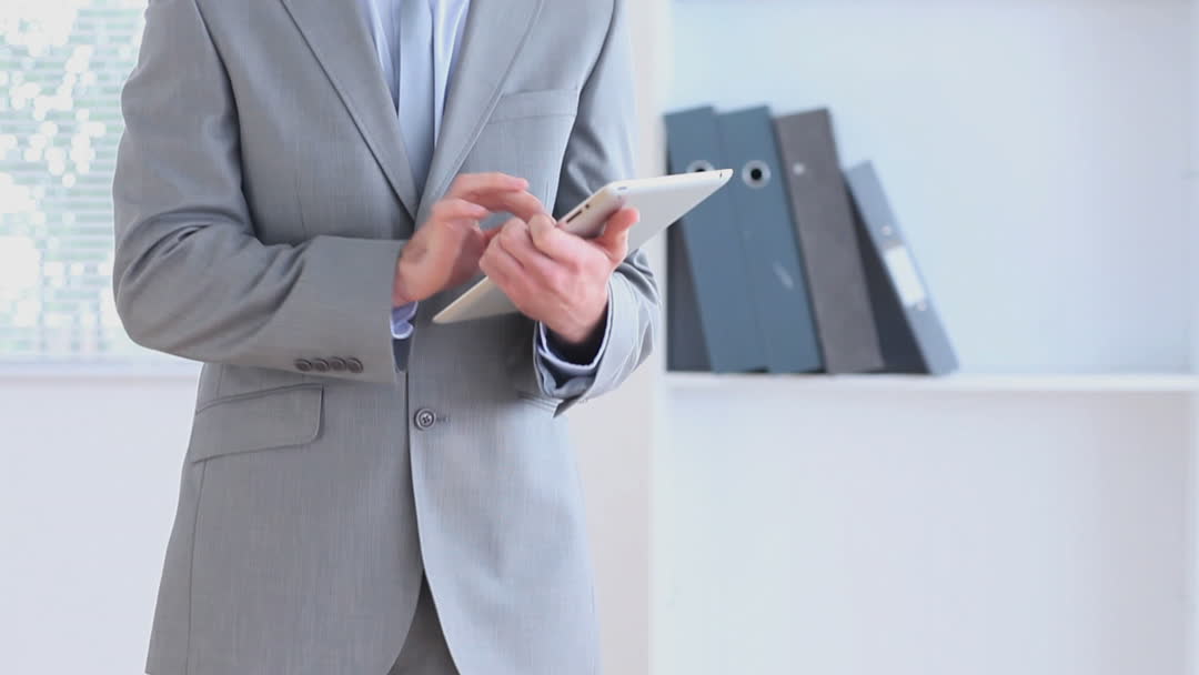 A businessman is using a tablet device in a modern office setting. The video focuses on technology and business attire. Suitable for use in articles about digital transformation in corporate environments, the importance of personal devices in business operations, or tech-savvy workspaces.