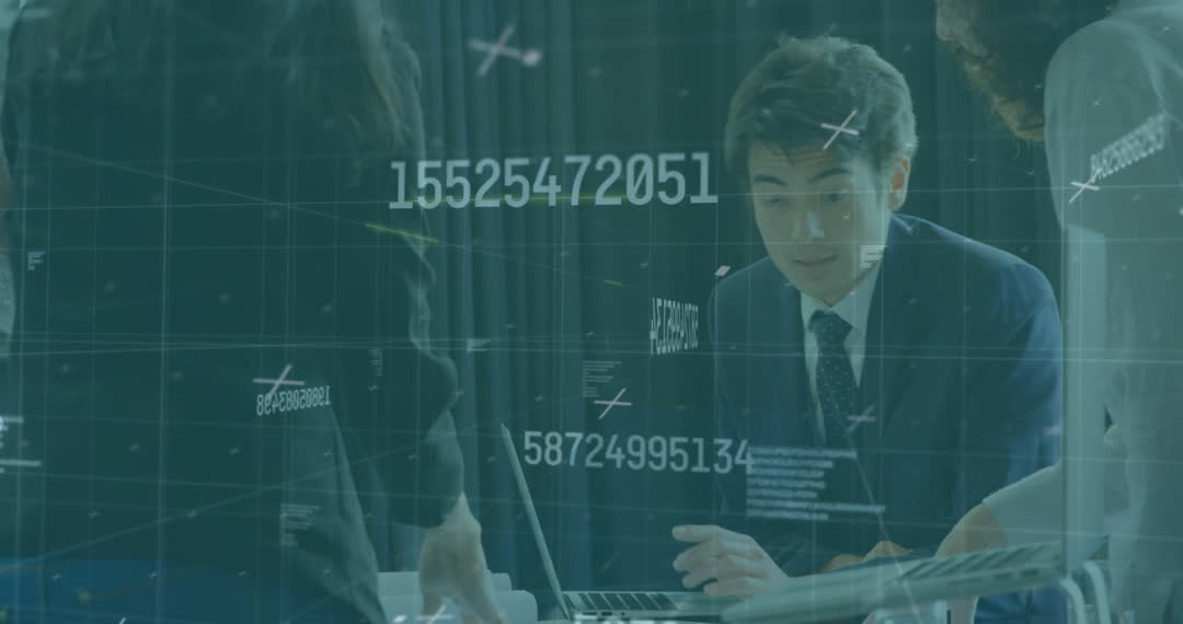 Numerical data and digital network graphics intersect with a scene of a businessman in formal attire actively discussing during an office meeting. Ideal for presentations or publications about business strategy, data analytics, team collaboration, and tech-forward business environments.