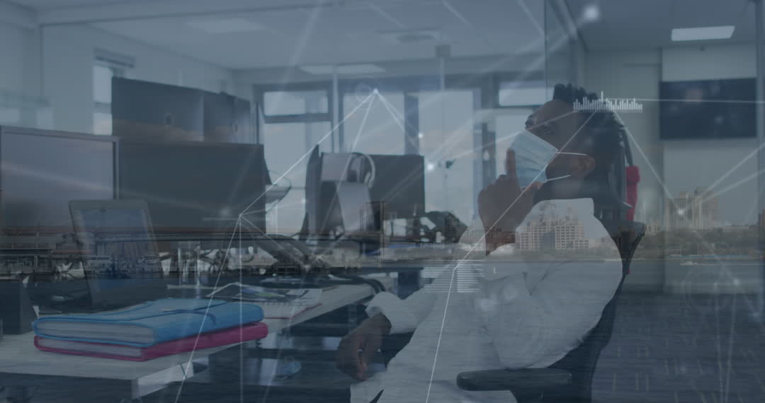 An African American businessman wearing a surgical face mask, seated in an office with digital connections superimposed over the scene. This visual concept highlights the intersection of modern business and technology, in a post-pandemic work environment. Ideal for use in presentations related to corporate policies, digital networking, remote work, and innovation in business practices, as well as illustrating impacts of COVID-19 on workplace dynamics.