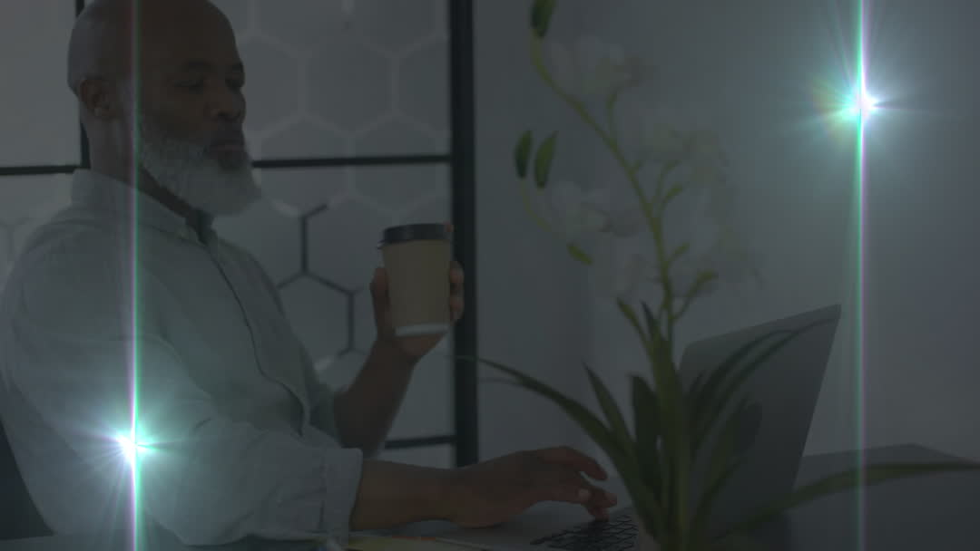 An elderly businessman works on a laptop while holding a coffee cup. Illuminating digital lighting effects add a futuristic touch to the workspace environment. Ideal for representing concepts such as modern business, technology integration, or illustrating everyday office productivity with a digital twist.