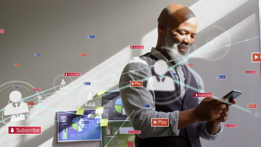 African American businessman stands in modern office engaging with digital media icons projected around him, symbolizing connectivity and innovation in business. Ideal for depicting technology in the workplace, digital transformation concepts, or future-focused business strategies. Use in articles about business technology trends or corporate digital workflows.