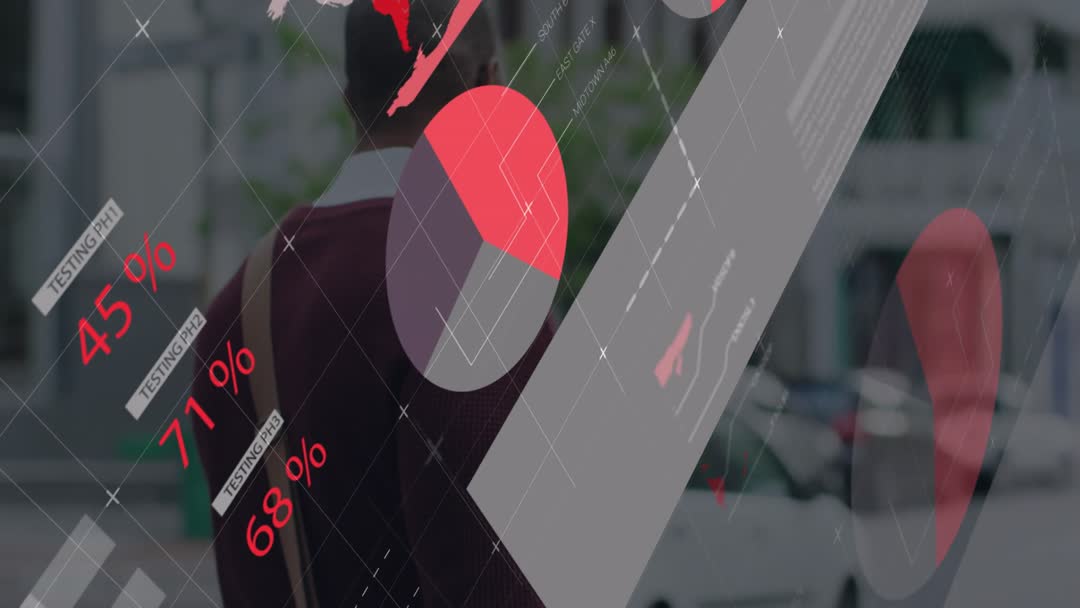 Futuristic scene featuring a mature businessman walking on a city street, overlaid with advanced data analytics dashboard displaying pie charts in red and grey colors. Perfect for illustrating concepts in technology, urban life, or professional business environments. Ideal for presentations, websites, or articles on data-driven decision making, smart cities, and tech advancements in everyday life.