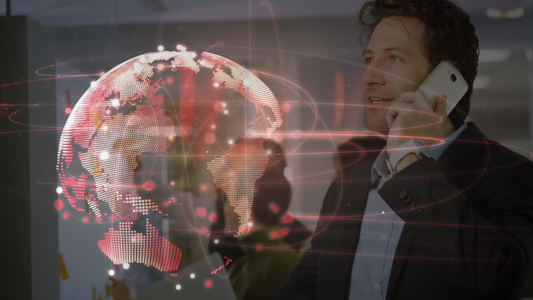 Image depicting a man engaged in telecommunications with conceptual digital globe overlay. Ideal for illustrating global business ventures, technological advancements, or international connectivity. Useful for businesses emphasizing their global outreach or digital transformation initiatives.