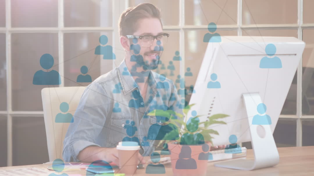 Caucasian businessman sits behind his computer, involved in data processing, with blue network icons overlaid symbolizing digital connectivity. Use this for content focused on digital interfaces, modern business practices, IT, or remote working.