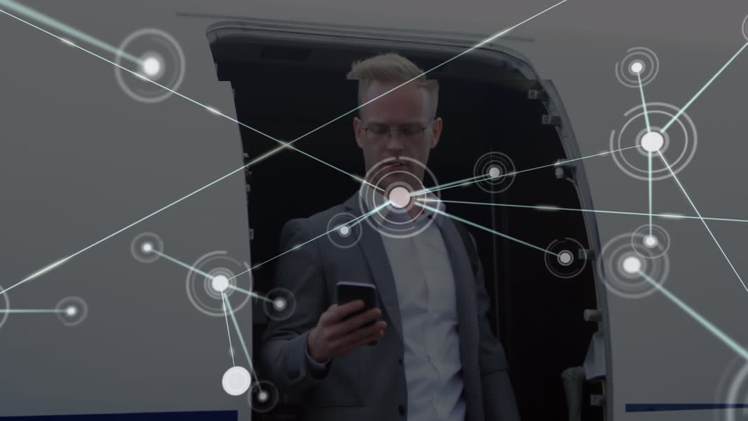 Modern businessman using smartphone while exiting aircraft surrounded by digital network graphics, symbolizing global connectivity and communication. Useful for illustrating themes of business travel, digital communication, and global networking. Ideal for presentations on corporate travel, technology integration in business, and the digitization of industries.