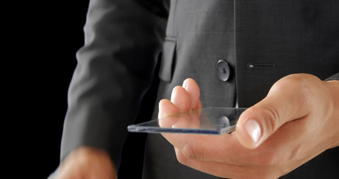 Businessman holding innovative transparent smartphone interacting with it against dark background. Suitable for themes of future technology, digital innovation, professional environments, and futuristic concepts. Useful for advertising tech products, illustrating articles on technological advancements, and corporate presentations.