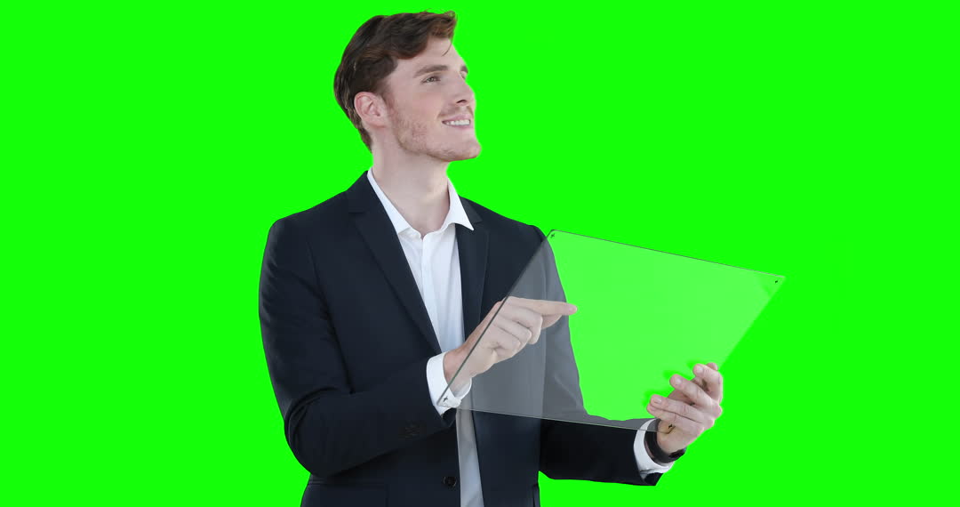 - Businessman Interacting with Transparent Tablet on Green Screen