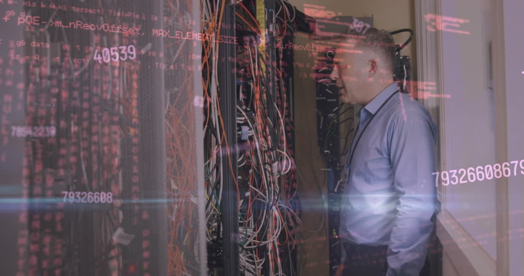 Middle-aged businessman examines network servers, surrounded by digital data overlay, implying advanced tech integration. Ideal for illustrating IT, data processing environments, and future technology visions. Applicable for promoting tech services, computer network firms, or data security insights.