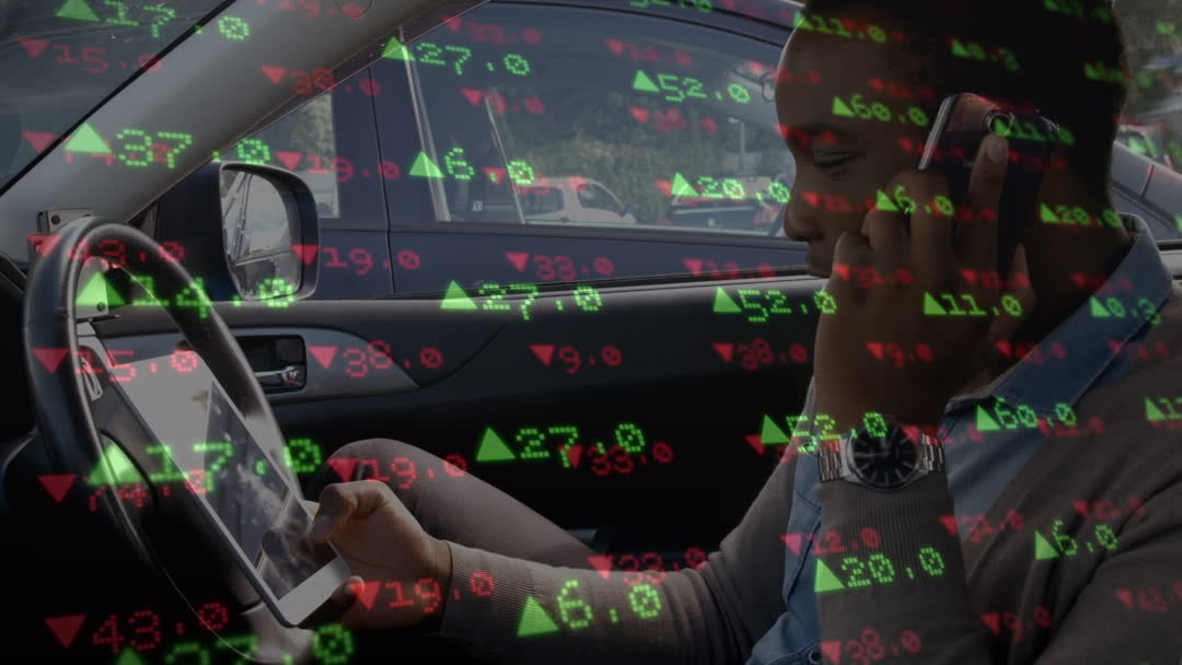 African American businessman using smartphone while seated in car, engaging with stock market data on tablet display. Digital stock numbers overlaid. Useful for concepts of financial trading, mobile business operations, digital finance trends.