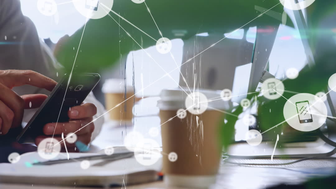 Image features a businessman engaged with a smartphone, surrounded by digital connections depicting social media and communication networks. This visual emphasizes the theme of connectivity and digital interaction in a contemporary work environment. Perfect for illustrating articles or content about modern communication technologies, social media strategies, or digital workplace transformation.