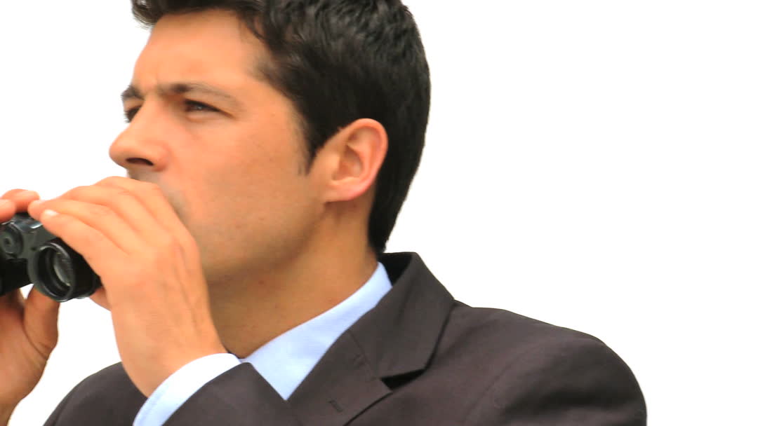 Business professional in suit using binoculars suggests themes of insight, strategy, and market analysis. Can be used for publications or projects focused on business foresight, financial planning, or visionary leadership. Suitable for illustrating concepts of careful examination of future trends or opportunities in business contexts.