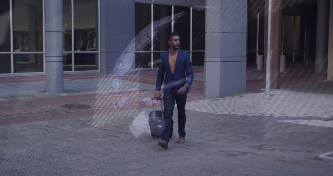 A stylish businessman walks through an urban environment, pulling a suitcase while high-tech fingerprint and globe graphics fade in juxtaposition. Checking his watch, he embodies the essence of modern connectivity, professionalism, and efficiency, making this ideal for themes around modern travel, business technology, or an advertisement showcasing cutting-edge digital solutions in professional contexts.