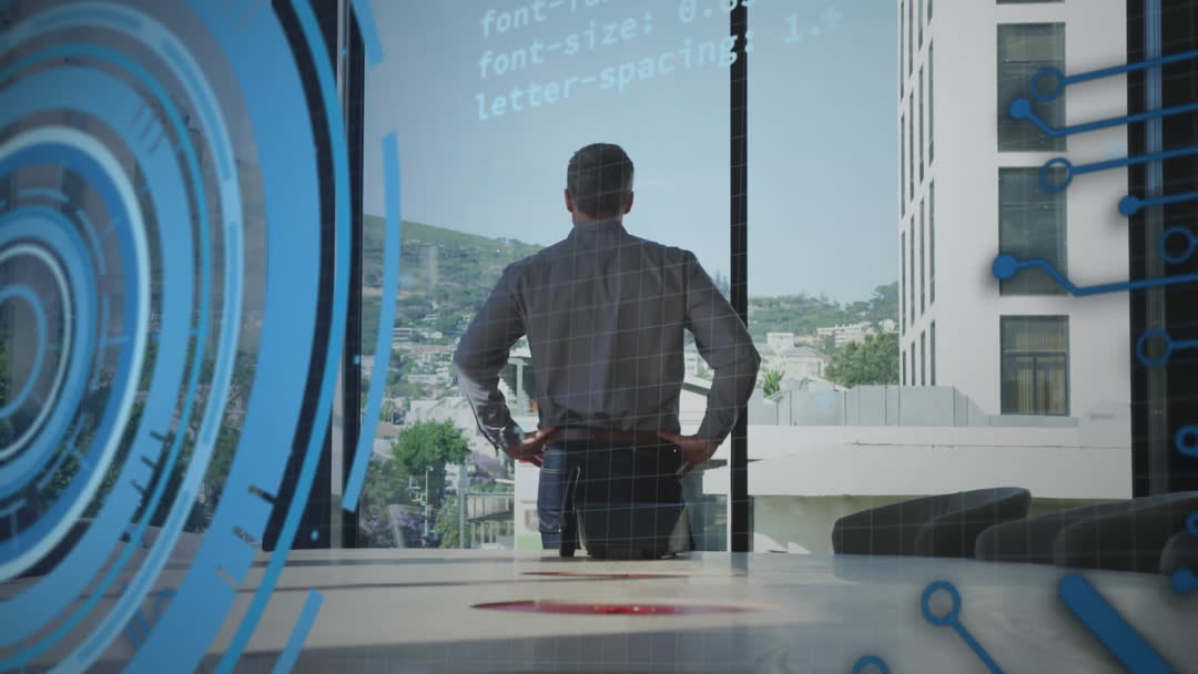 Businessman stands by window, looking out at cityscape. Futuristic digital elements, like coding and geometric circular graphics, blend into the scene, symbolizing interaction with digital technology and modern innovation. Ideal for themes of leadership in tech, advanced business strategy, and digital transformation.