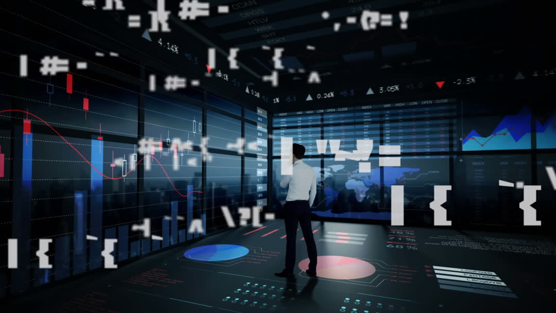 Businessman standing before high-tech screens displaying financial graphs and equations. Ideal for illustrating concepts in data science, technology in business, or market analysis applications.
