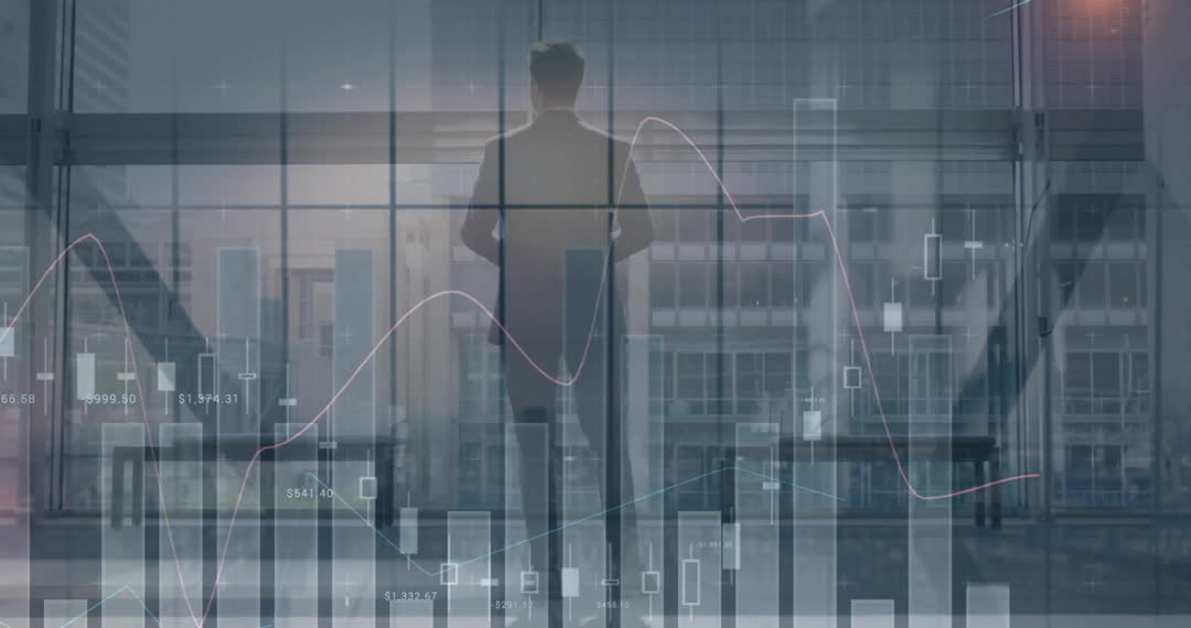Silhouette of a businessman standing in modern office superimposed with animated financial graphs and stock market trends. Ideal for presentations on economic forecasts, corporate strategy planning, business reports, and investment articles.