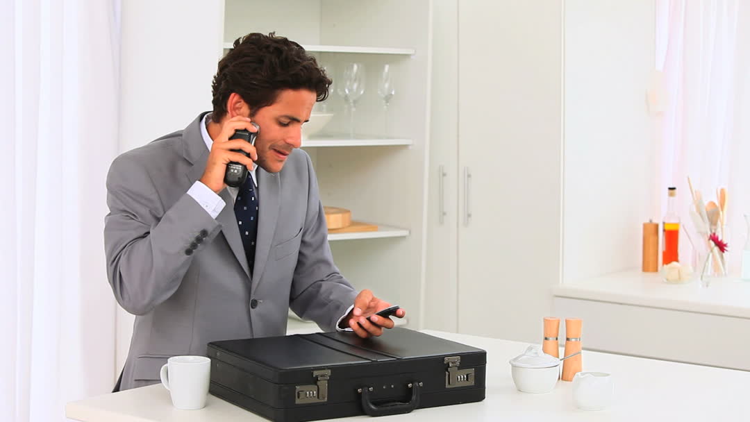 A businessman in a gray suit shaves with an electric razor while checking his smartphone at a countertop, adding a sense of multitasking to his morning routine. Casual elements like a cup and briefcase highlight an everyday preparation for work. This scene can be used in articles about crafting efficient morning routines, balancing personal care with busy schedules, or promoting grooming products for professionals.
