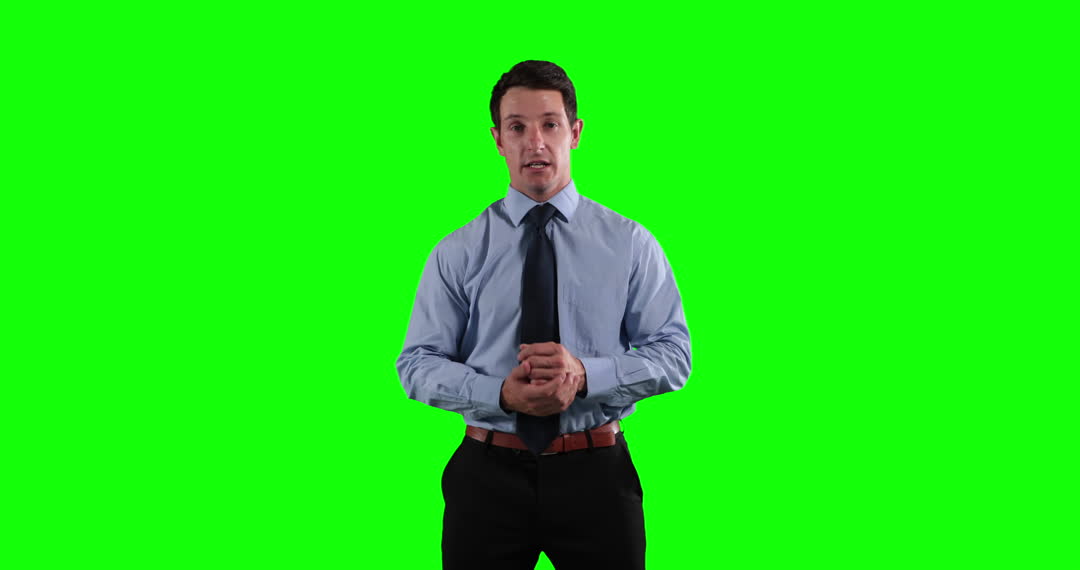 This shows a Caucasian businessman engaging with an unseen audience. Ideal for use in professional presentations, corporate video backgrounds, or promotional material requiring dynamic and adaptable content. The green screen enables easy integration into various media and virtual environments.
