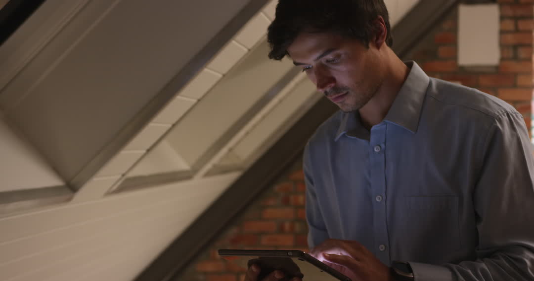 Caucasian businessman diligently using tablet in modern loft-style office. Image reflects a figure engrossed in his work against a contemporary backdrop with brick wall and triangular windows, depicting concentration and tech usage. Ideal for illustrating digital business environments or articles about modern work practices.