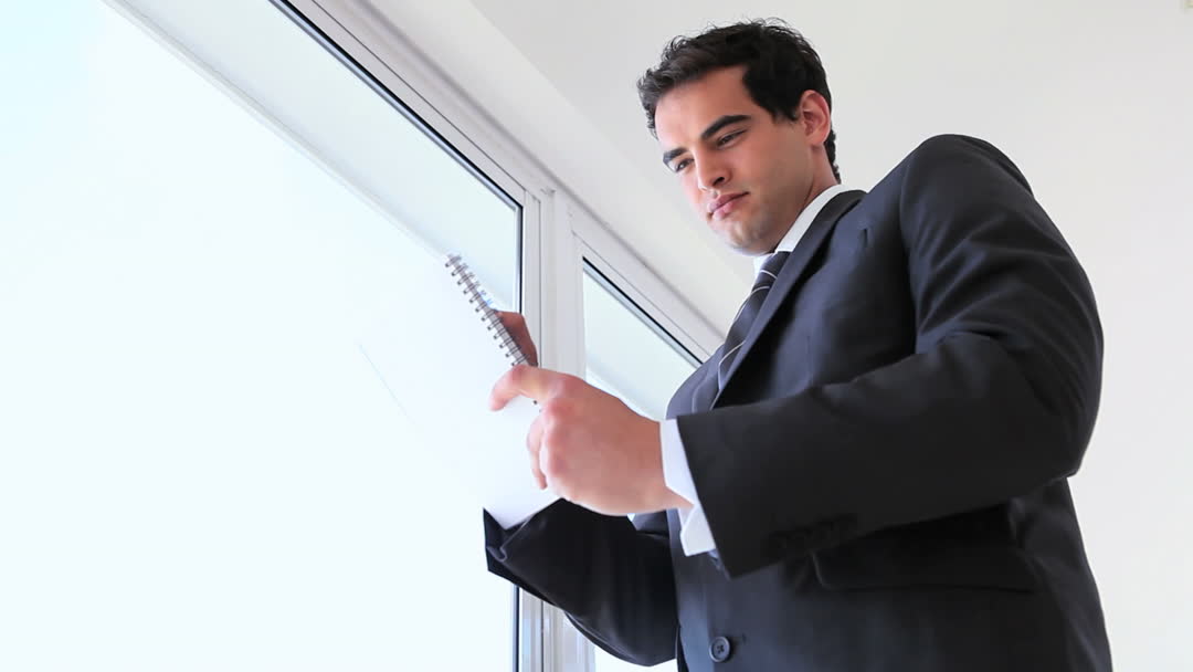 A businessman wearing a dark suit stands by a large window reading a notepad. His thoughtful expression suggests he is concentrating on important work-related matters. This is ideal for illustrating business meetings, corporate planning strategies, presentations, or articles about professionalism and work ethics.