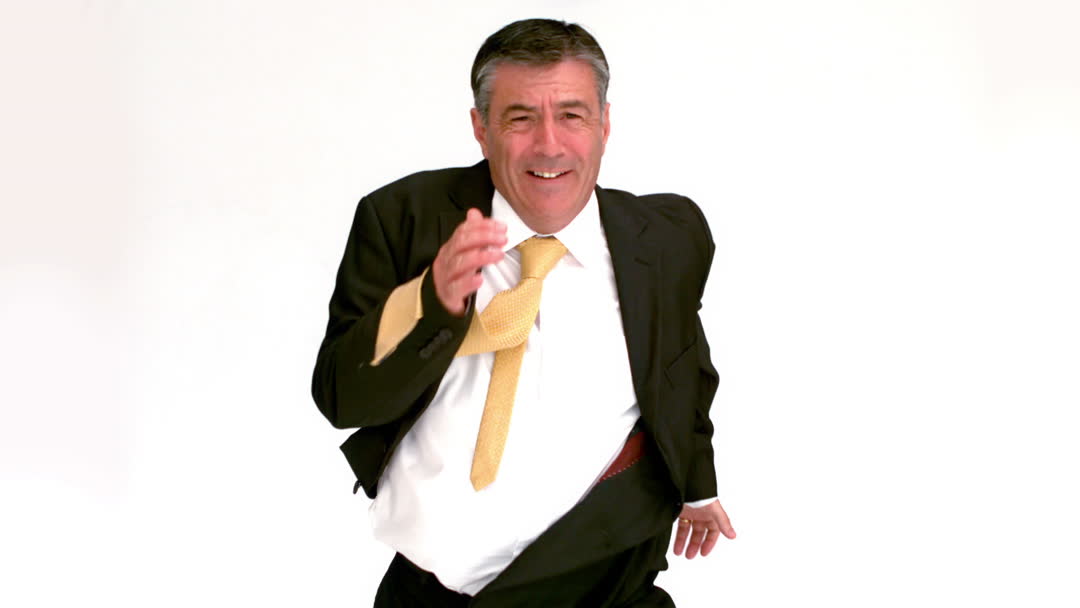 Smiling businessman wearing a suit depicted in motion against a white background. Perfect for illustrating themes of determination, motivation, pursuit of success, and business professionals leading dynamic lifestyles. Useful for advertisements, corporate materials, and motivational presentations.