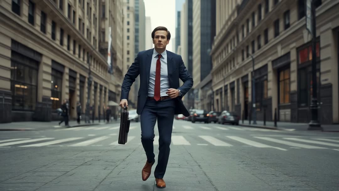 AI Generated Image. A businessman in a navy suit dashes across a New York City street clutching a briefcase. The scene captures the bustling dynamism of urban professional life. This video frame is ideal for illustrating articles about business lifestyle, workplace energy, or city reports. It embodies movement, urgency, and the quintessential corporate environment familiar to metropolitan settings.