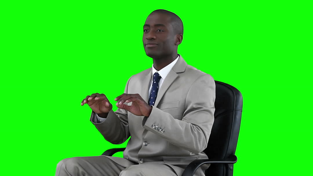 A businessman in a gray suit sitting on a chair, focusing as he simulates typing on a virtual keyboard against a green background. The vibrant green color indicates a green screen environment, representing adaptability in media production. Ideal for projects involving digital interfaces, virtual activities, technology presentations, or creative montages.