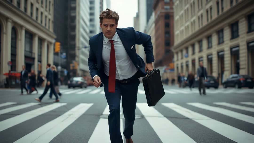 - Businessman Sprinting Across City Crosswalk in Busy Urban Environment