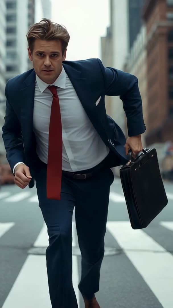 AI Generated Image. Showing businessman sprinting across downtown crosswalk while carrying briefcase, tie fluttering, suit moving with momentum. Capturing urgent commute, fast-paced corporate life, high-stakes deadline moment. Offering vertical format optimized for social reels, stories, mobile ads, and corporate promo content. Pairing with bold text overlays, upbeat percussion-driven soundtrack, and strong call-to-action for recruitment, productivity, time-management, or financial services campaigns. Working well for startup pitch videos, business presentation openers, news segments about urban commuting or career ambition, and website hero backgrounds. Providing dynamic motion, shallow depth of field, and authentic city backdrop for polished corporate storytelling.