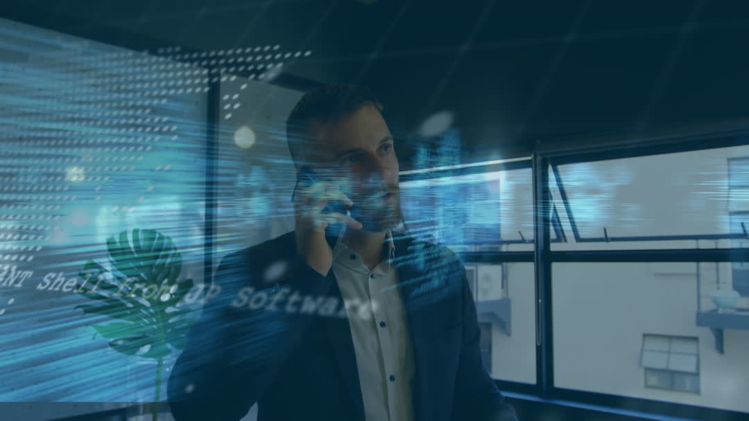 Caucasian businessman engaged in phone call with overlay of digital data, capturing essence of modern corporate environment and technology integration. Suitable for illustrating concepts like business communication, technological advancement, and professional environments. Ideal for websites, media related to business productivity, and digital innovation content.