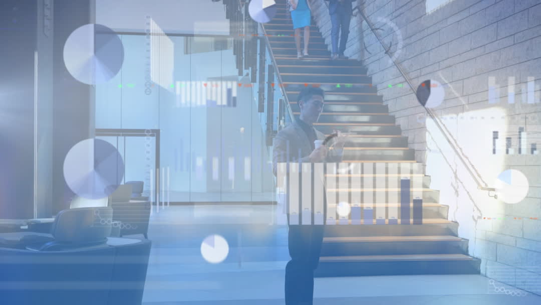 Businessman communicating through a mobile phone in a stylish office setting using a data overlay concept to illustrate global networking and business technology. This can be used for materials related to corporate growth, technology advancement in workplaces or highlighting importance of communication and data in modern business.