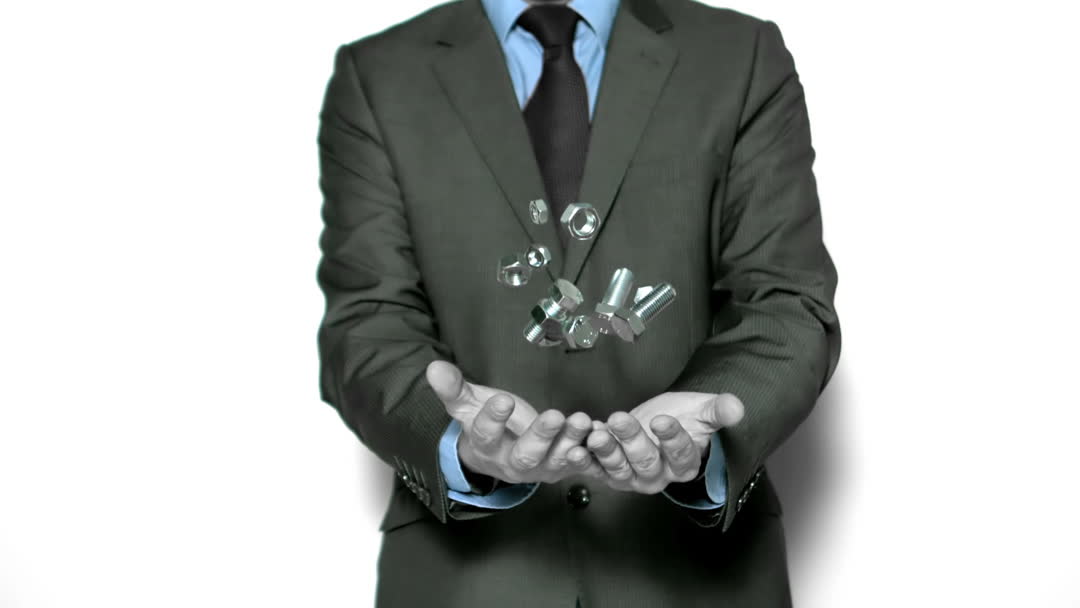 Depicts businessman in suit throwing bolts and screws against white background, symbolizing creativity and focus. Suitable for business-themed materials or articles related to innovation, strategy, or problem-solving.