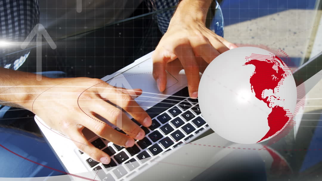 - Businessman Typing on Laptop with Globe and Arrows Graphic Overlay