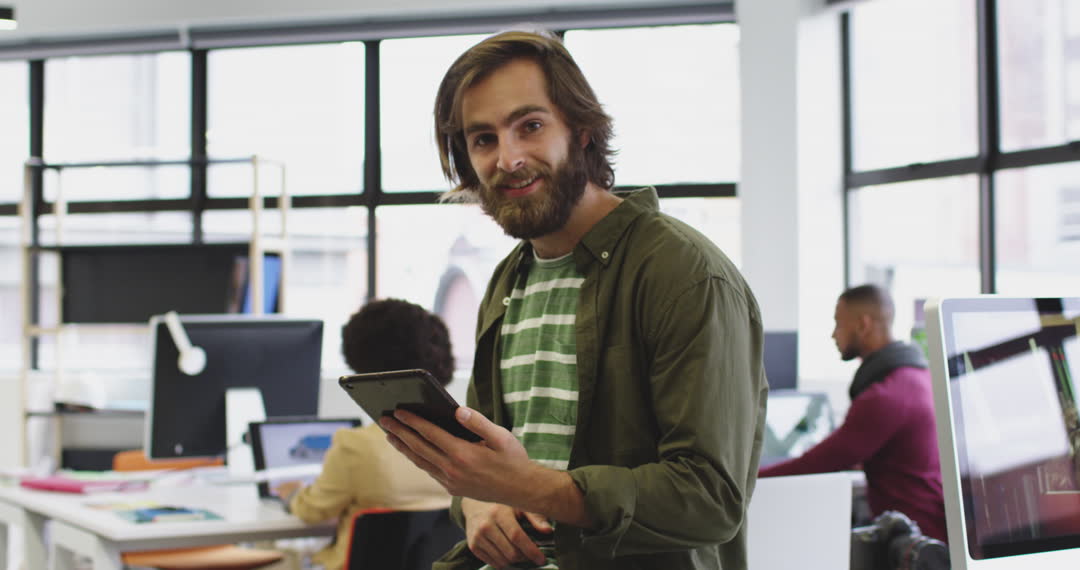 A Caucasian businessman smiles while using a digital tablet in a modern office, reflecting a productive and professional mood. Coworkers are seen in the background, creating a collaborative and dynamic workplace. Useful for illustrating business environments, teamwork, and technological interaction in office settings.