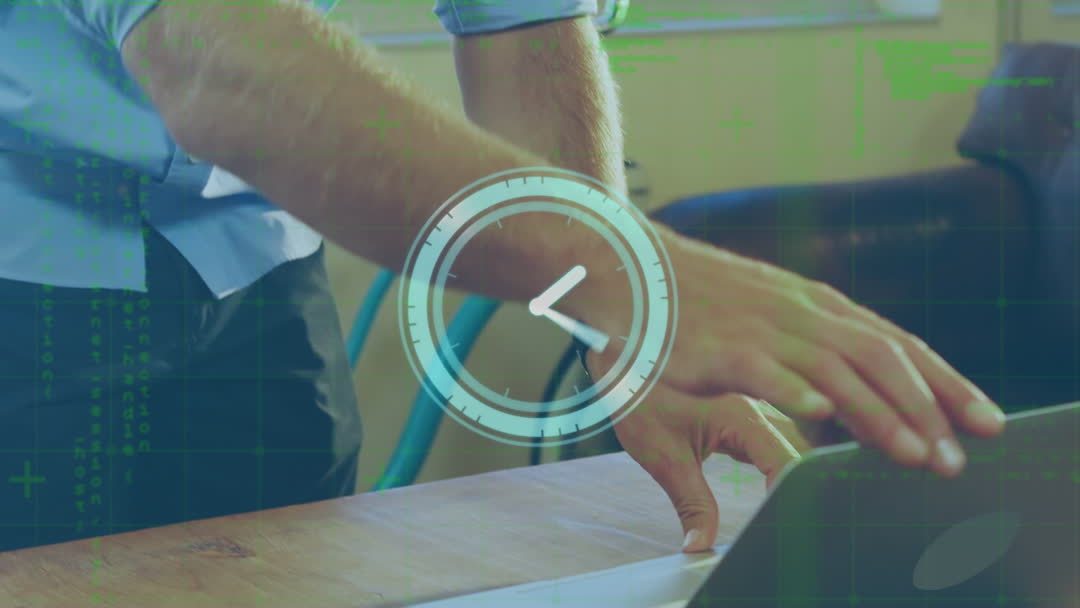 This visual captures a businessman interacting with a laptop, overlaid with digital technologies. It suggests a blend of traditional work tasks with modern tech. The timestamp and digital data elements add a futuristic dimension. Useful for illustrating themes of innovation, modern business practices, time management in digital contexts, or corporate technology advancements.