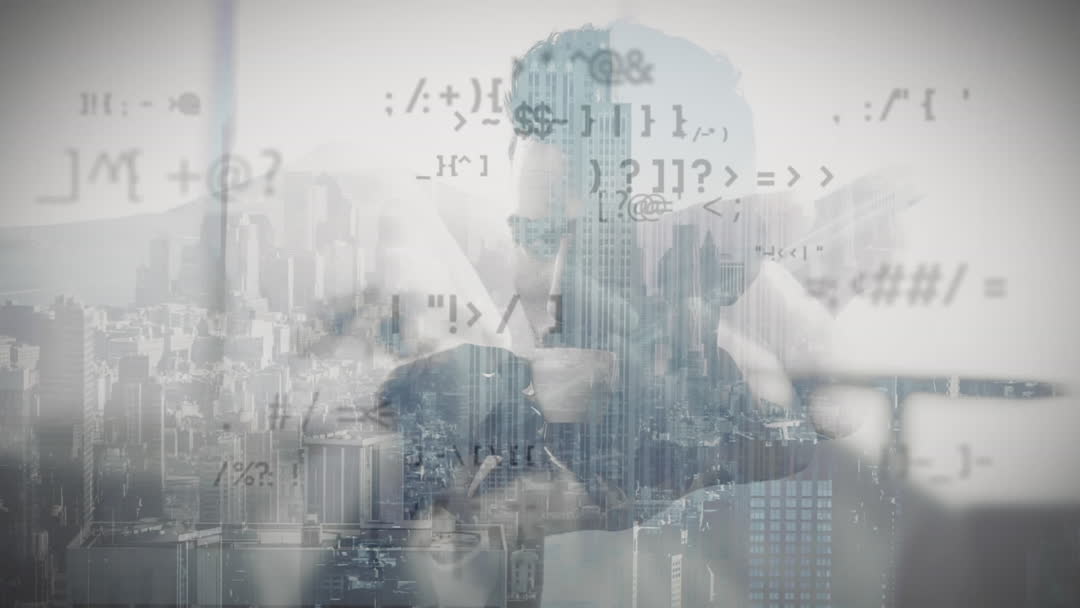 This visually compelling and innovative video presents a businessman seen on his phone with a superimposed abstract of digital symbols and a city skyline, symbolizing modern technological interconnectivity. Ideal for illustrating articles on digital economy, design in business communications, integrating technology in daily life, or presentations on urban business innovations. The multi-layered composition emphasizes a connection between business and technology in metropolitan contexts, suitable for use in technology promotions and related visual content.