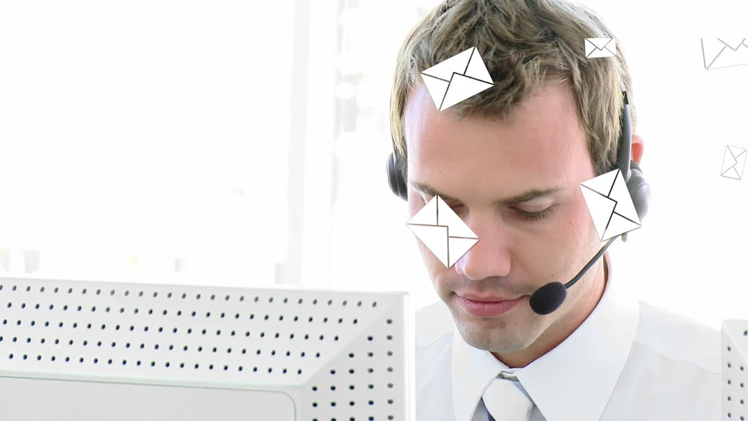 Businessman engaging in digital communication represented through animated envelope icons. Ideal for concepts related to technology, customer support, professional communication, or illustrating global business interactions. Useful for articles, websites, or advertisements promoting IT services, virtual teamwork, or modern business solutions.