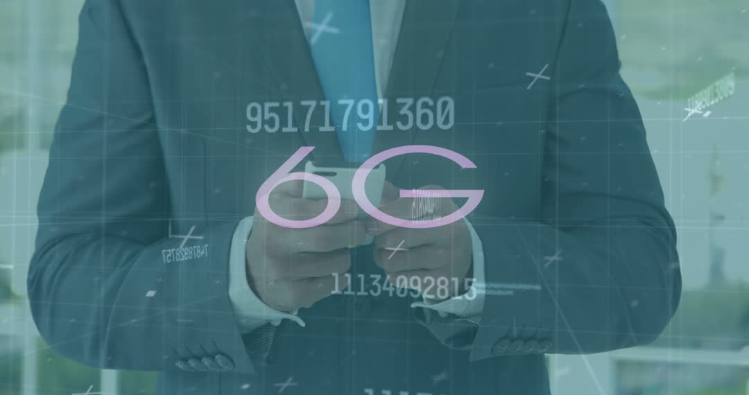 - Businessman Using Smartphone with 6G Network Concept Overlay