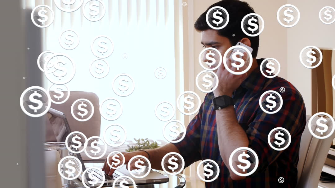 Conceptual video of a businessman engaging in financial discussions over the phone, with digital dollar symbol graphics overlay symbolizing business, finance, and technology. Useful in illustrating themes of entrepreneurship, modern economics, financial planning, and technological communication for business promotions, articles on fintech innovations, and investment strategies.