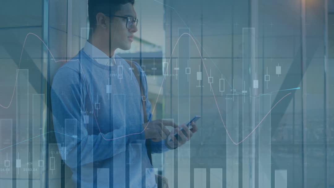 This video features a businessman using a smartphone against a background of digital financial charts, emphasizing themes of technology in modern business, finance analysis, and trading. It can be used in articles or presentations related to financial markets, tech startups, investment decisions, and data-driven enterprise solutions.