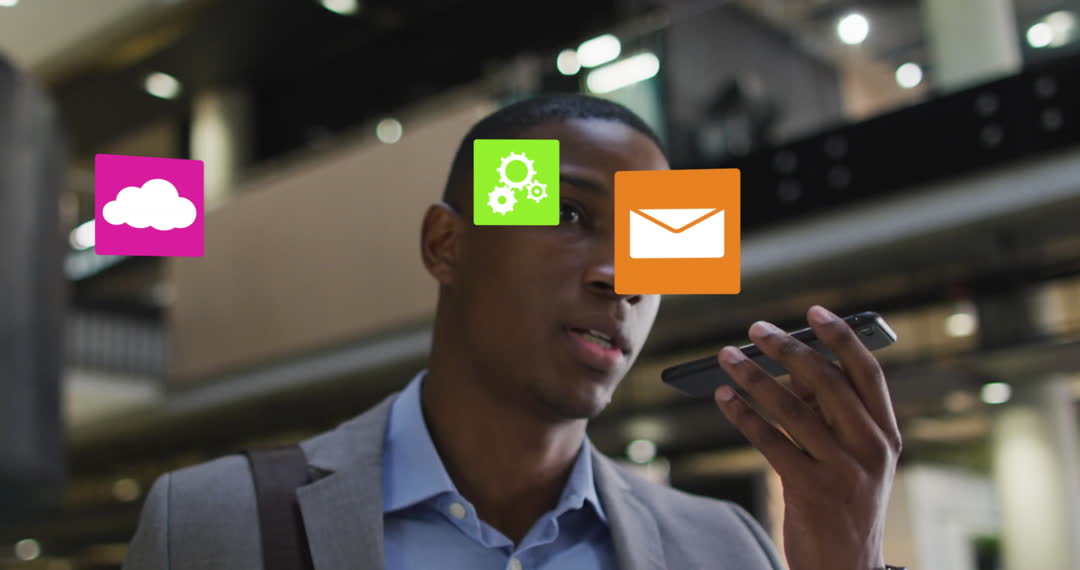 An African American businessman speaks into a smartphone with digital icons representing cloud computing, processing, and email overlaid. This is perfect for illustrating themes of modern communication, digital interaction, and business technology enhancement. It can be used in content related to global business, technological innovations in the workplace, and professional networking services.