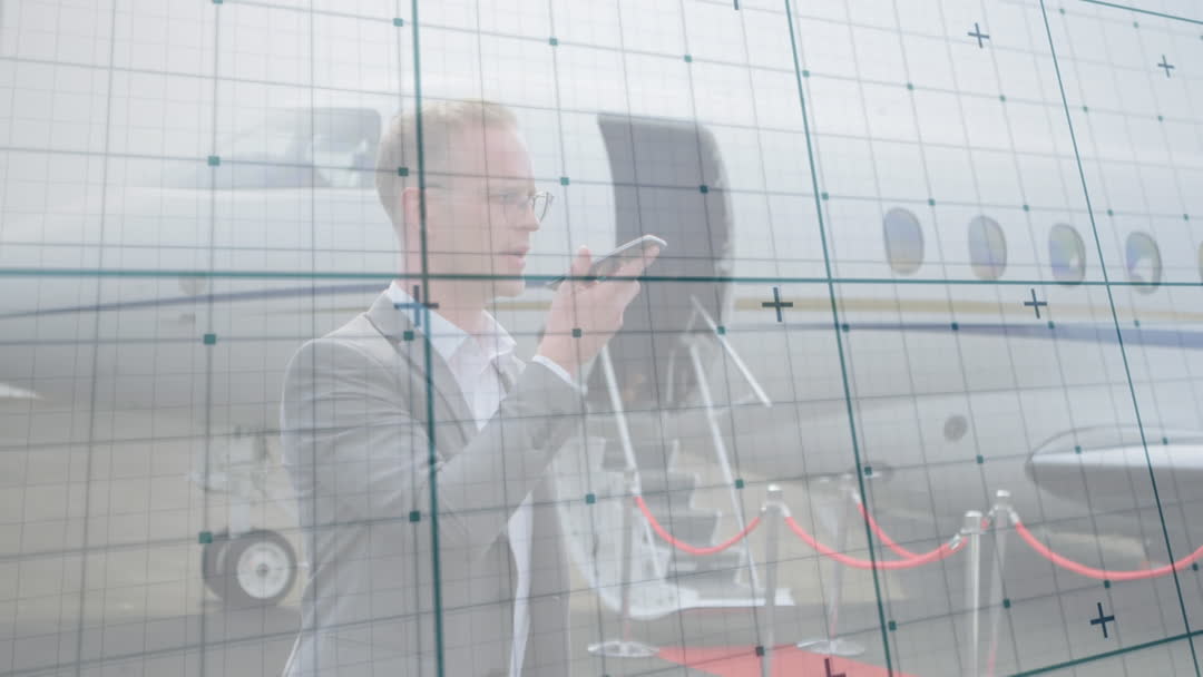 An executive in a sleek suit is focused on his smartphone while standing by a private jet, overlayed with dynamic financial data charts and grids. This visual could illustrate modern finance, technology communication in the corporate world, or a business trip. Ideal for business or financial magazine covers, articles about digital innovation, or content promoting airline and technology services.