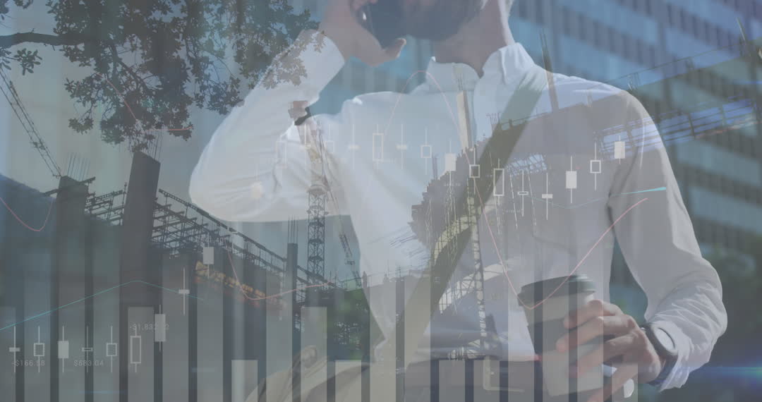 Businessman holding smartphone and coffee cup overlaid with financial data and graphs, symbolizing the integration of communication technology with financial analysis. Suitable for representing concepts of financial communication, digital economy, and modern business environments.
