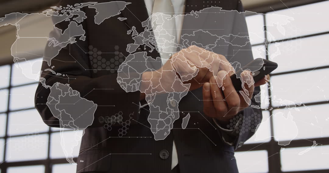 This video shows a businessman interacting with a smartphone against a backdrop featuring a global map overlay, symbolizing connectivity and data processing. Use this for illustrating articles or presentations on global communication, technological advancements, or business networks. Ideal for content related to international business, tech innovations, and connectivity solutions.