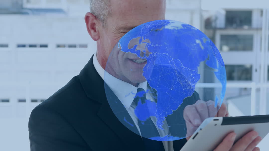 Businessman Using Tablet with Digital Globe Overlay for Global Connection Video
