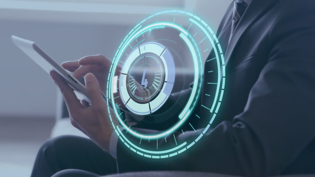 A businessman in a suit interacts with a tablet, featuring a futuristic digital interface overlay with countdown animation. This visually communicates the integration of technology and modern business practice. Ideal for illustrating technological innovation, digital transformation in business, or promotional materials for tech solutions targeting professionals.