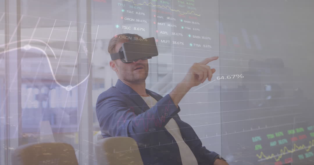 - Businessman Using VR Headset for Virtual Data Analysis in Modern Office