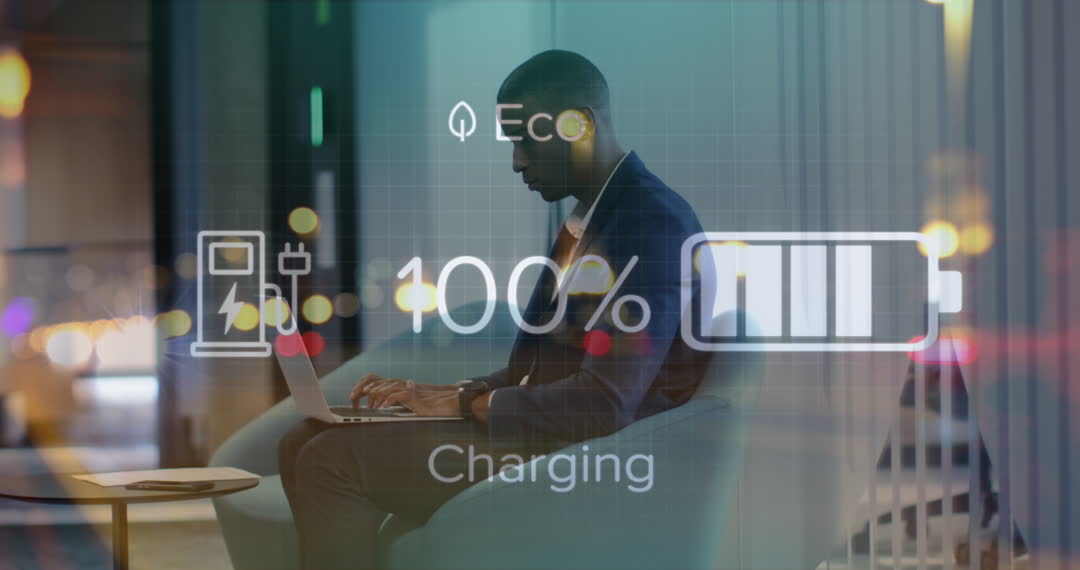 Young businessman working on a laptop with battery charging overlay sign. The animated icons related to energy conservation, emphasis electronic elements viewed through transparent layers. It can serve as a metaphor for technology integration in modern workspace, ideal for articles or campaigns highlighting digital education, sustainable energy, workplace productivity, or tech innovations.